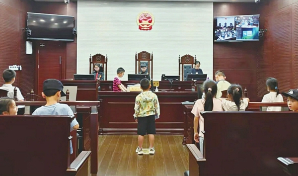 活动临近结束,孩子们期盼已久的模拟法庭环节粉墨登场。经过预先准备,孩子们被分为审判长、审判员、书记员、被告人、法警等角色。 孩子们身着法官服,手持法槌,在法庭内展开了一场激烈的“审判”,完整还原了法庭审判的各个环节。通过本次模拟法庭,孩子们也深度了解了庭审的基本流程和相关法律知识,紧张、严肃的庭审氛围让他们身临其境地感受到了法律的威严。