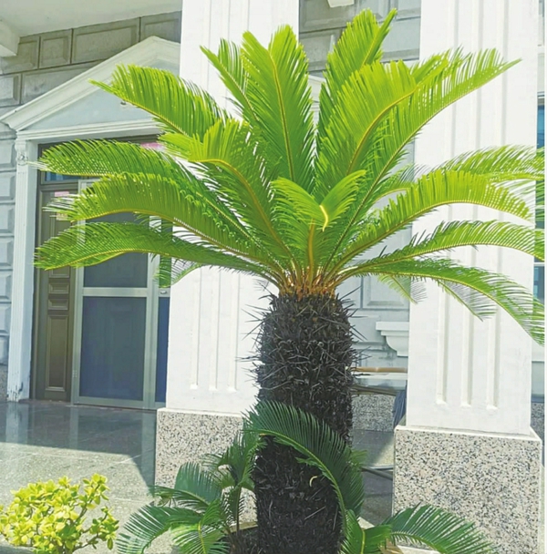 其实,铁树是热带植物,在南方温暖地区,地栽的铁树很容易开花。但在北方,由于气候环境的原因,还有铁树属于雌雄异株,开花相对南方来说,比较罕见。铁树株形美观大方,四季常绿,粗壮的主干坚硬如铁,羽状分裂的叶片清新飘逸,像一片片大气吉祥的绿色孔雀羽毛般碧绿光亮,常年生机勃勃,主干上布满落叶痕迹,如鱼鳞斑斑,古朴典雅,极富观赏价值,人们常用来庭院地栽或是盆栽美化环境。