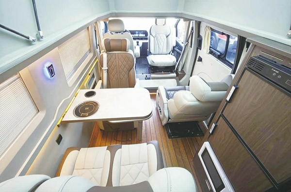 3. 空间魔法: 米色+巧克力棕内饰配游艇木地板,主副驾+航空座椅全能360度旋转,升起车顶后,一楼会客区秒变四人茶室,二楼睡两人,一家四口妥妥够。