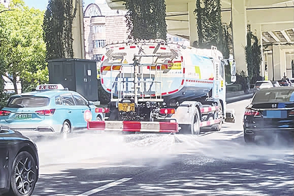 图为上午9:59,一辆洒水车经过漕宝路、 宾阳路路口,洒下一路清凉殷志军 摄影报道
