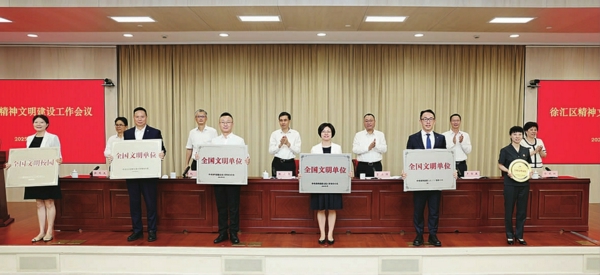 会议传达了习近平总书记关于精神文明建设的重要指示精神以及全国精神文明建设表彰大会、市精神文明建设工作会议精神,部署了2025年徐汇区精神文明建设工作及推进文明城区建设常态长效行动,宣读了徐汇区荣获第七届全国文明单位、第三届全国文明家庭、文明校园名单以及复评通过名单,并为荣获全国级荣誉的集体和个人颁奖。 漕河泾街道、浦银金融租赁股份有限公司、上海市上海中学作交流发言。