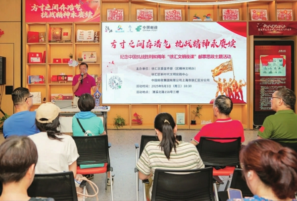 徐汇区新时代文明实践中心日前化身为穿越时空的红色课堂,“方寸之间存浩气 抗战精神永赓续” 纪念中国抗战胜利80周年“徐汇文明夜课”邮票思政主题活动在此举行。
