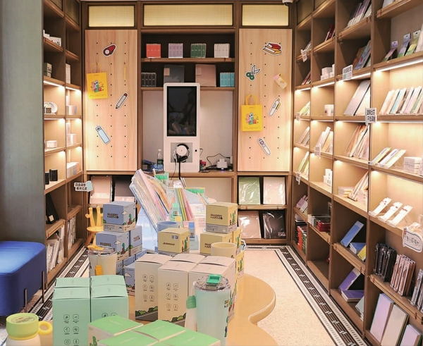 本次快闪活动现场还有与知名IP“JOGUMAN乔古漫”的联名款,乔古漫是来自韩国ins工作室joguman.studio的创作IP。看上去有些笨拙的小恐龙, 却是都市打工族缓解焦虑、 治愈心灵的新伙伴。在活动现场,可以看到各种印有乔古漫的文具用品、手账本、资料册、修正带以及水杯。