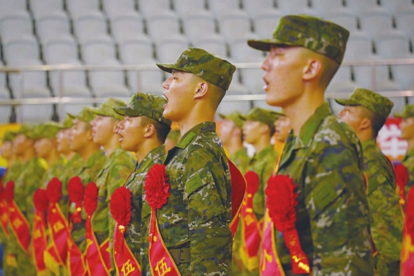 “有荣誉就争,有红旗就扛!”“请相信自己有无限的潜能,相信作为人民子弟兵的我们能战胜一切困难和挑战,成为一名合格的军人!”来自上海交通大学的龙翔和华东理工大学的冯宇辞代表全体新兵表决心。
