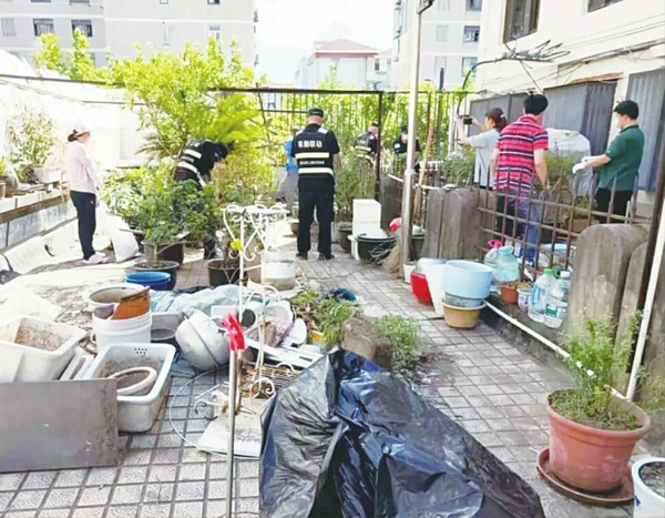 十余个浴缸、几十个花盆渐渐占满了平台大半空间。 后来种植的居民年纪大了打理不动,杂草疯长,蚊虫扎堆,沤肥的臭味隔着窗户都能飘进家。 一到台风天,泥水漫流堵了下水管,居民进出得踮着脚走。 大伙找房主沟通,可不少房主常年不在本地,问题拖了一年又一年。