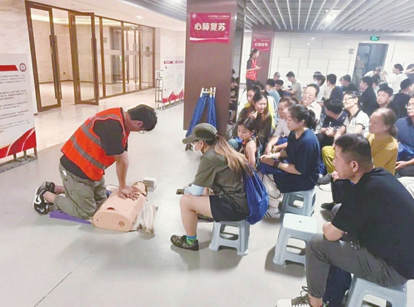 11时45分,空袭警报拉响,专业队伍和志愿者迅速就位,针对掩蔽人员开展心肺复苏、紧急救助、逃生绳结等应急技能教学演练,全方位模拟实战场景,提升应对突发事件的能力。