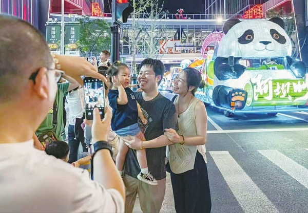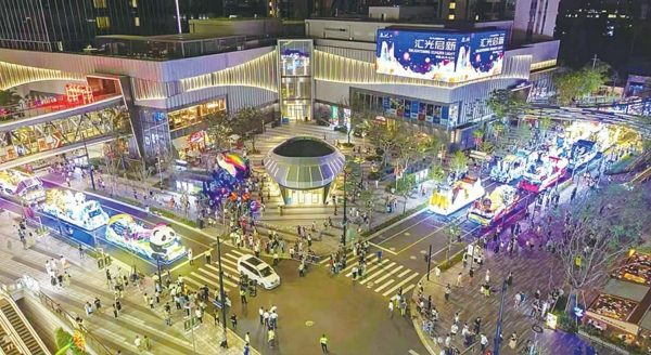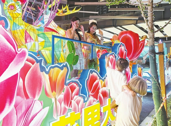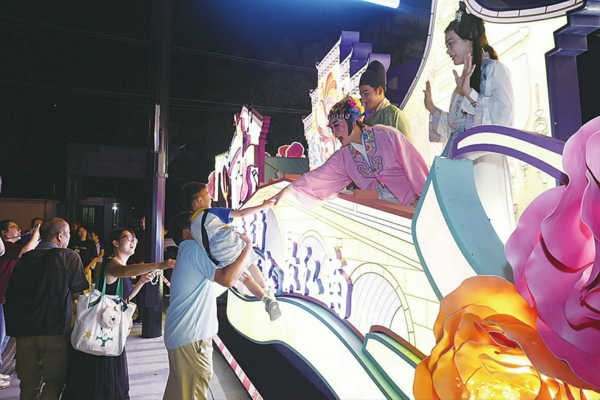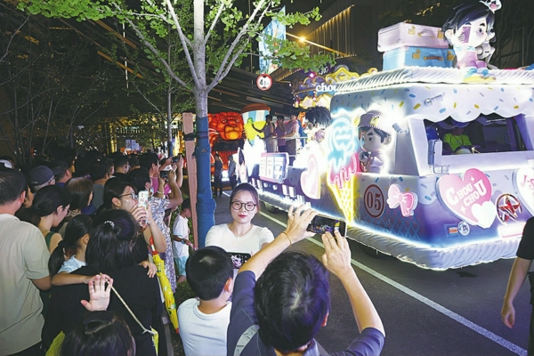 花车各具风情,“周同学”IP花车播放经典旋律,抖音“乐活上海”主题车融入商圈元素,各式角色扮演者穿梭花车间互动,萌物咻咻的“次元光镜”实时捕捉花车影像,让市民在虚实交织中感受新奇体验。 天桥与商场露台挤满观众,快门声与欢笑交织,定格节庆瞬间。