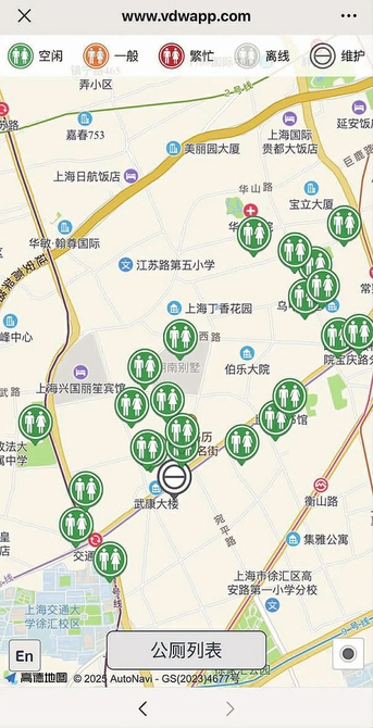 如今,游客只需扫描地图二维码,即可进入“梧桐智慧寻厕”小程序。 系统清晰标注5个公共厕所及31个共享厕所位置,支持实时定位最近点位。平台采用红、黄、绿三色标识“繁忙”“较少”“空闲”状态,帮助游客合理选择,实现智慧分流,缓解高峰“找厕难”“排队久”问题。 步行导航功能更实现“一键找厕、方便无忧”。