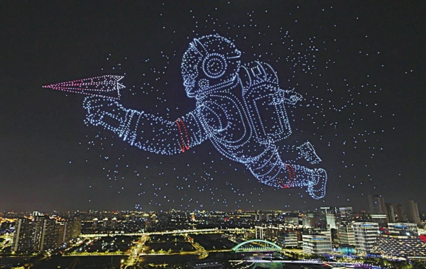入夜后, 徐汇滨江华灯初上。 随着五彩缤纷的上海国际光影节标志点亮夜空,4000架无人机组成的庞大编队在空中次第勾勒出一幅幅绚丽多彩的巨型画卷。 这些“光影精灵”时而化作武康大楼等徐汇地标建筑, 时而变身上海美术电影制片厂的奇幻动画IP形象,时而又幻化成手持纸飞机的宇航员与奔腾的飞马。 美轮美奂的光影交织出奇幻浪漫的氛围, 让在场市民与游客沉醉其中。