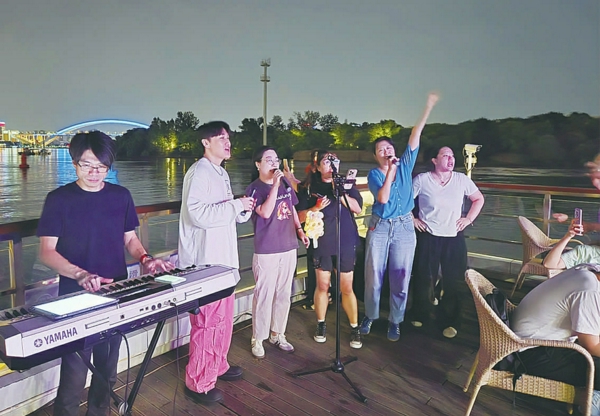 演出中途, 互动环节更是将气氛推向高潮。 当乐队邀请观众上台合唱《稻香》时,几位年轻游客主动举手, 接过话筒与乐队默契配合(如图)。“没想到大家这么热情! ”乐队主唱笑着说,“看到大家跟着音乐互动, 我们也感觉特别有感染力, 这就是中秋团圆的意义吧。”游轮外,月光洒在江面上,波光粼粼,与船舱内的歌声、笑声融为一体, 构成一幅温馨的“月下浦江夜曲图”。
