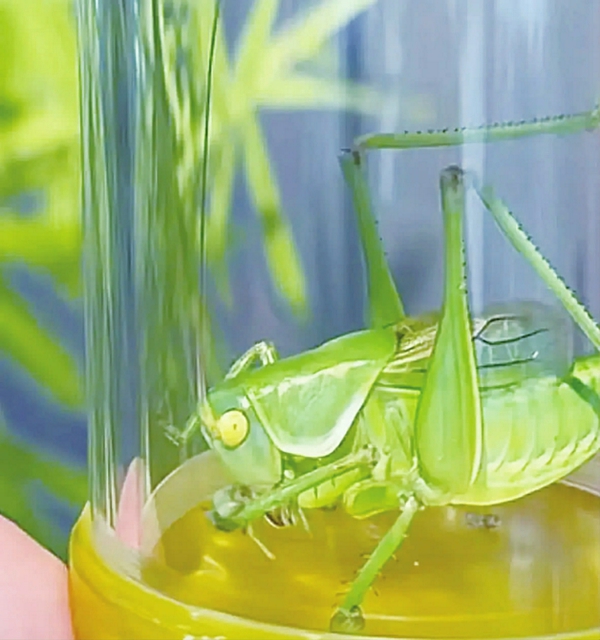 要想蝈蝈活得久,持续保持翠绿,千万要让蝈蝈吃素,不要让蝈蝈吃肉。素和肉的比例可以是10 : 1。 之前我经常给蝈蝈喂肉食,比如天牛、蚂蚱、活泥鳅、活的小鱼小虾和各种昆虫,蝈蝈非常爱吃,抱上去就啃,一天能吃七八个蟋蟀,两个天牛。但是后来肚子变得非常大,很快就挂了。