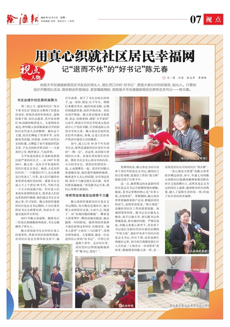 更难得的是,陈元春还为社区培养了多位年轻党总支书记,她用自己的言传身教,把基层工作的“接力棒”稳稳交到了后辈手中。