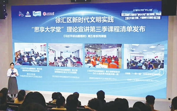 “思享大学堂”作为徐汇区新时代文明实践理论宣讲的重要品牌项目,自启动以来便致力于突破传统理论宣讲的界限,探索更加高效、精准的传播方式。 徐汇区委宣传部(区精神文明办)与辖区内上海交通大学等高校马克思主义学院开展深度合作,借助高校马院在专业理论研究和宣传宣讲方面的优势,每月以“按需点单”的方式,向全区各街镇新时代文明实践分中心、居民区实践站、文明实践特色阵地、文明校园等配送高质量的理论宣讲类课程。 这一创新模式不仅推动了理论宣讲向基层的广泛延伸,更让党的创新理论真正“飞入寻常百姓家”。