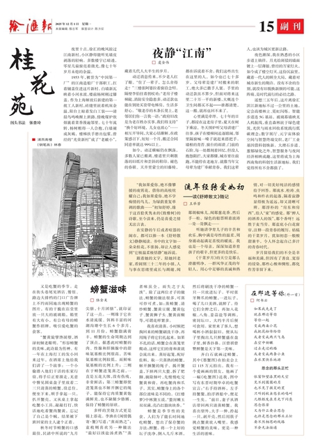 齐白石就画过螃蟹,其中《墨蟹图》在拍卖会上以115万元拍出。 我有一个爱画画的朋友, 他画了一幅《吃蟹图》送我,图中写有东晋时期毕卓的吃蟹宣言:“右手持酒杯, 左手持蟹鳌,拍浮酒船中,便足一生矣。 ”前日,妻子从酒店带回两只清蒸螃蟹。 我喜出望外,大手一伸,拎起一只,剥开壳,然后用筷子挑点蟹黄放入嘴里。 我感觉螃蟹的美味, 更是一种生活的滋味。