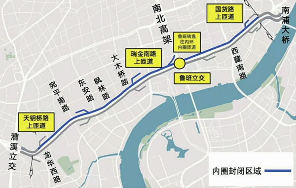 周一至周日夜间24时至次日晨6时内环高架(南浦大桥至龙华西路) 内圈主线封闭, 鲁班转盘往内环内圈匝道封闭。