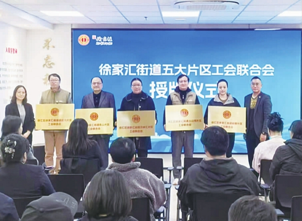 徐家汇街道工会服务体系建设迈入新阶段。 近日, 徐家汇街道总工会成立片区工会联合会, 覆盖辖区赵巷、乐山、土山湾、徐虹北、 万体汇等5个片区。 这一创新举措以“地域相邻、 资源整合、 服务精准、 治理高效” 为核心原则, 将工会服务触角延伸至园区、商圈、楼宇、小区等职工集中区域, 为辖区广大职工及新业态从业者搭建起全方位、多层次、精细化的服务平台。 劳模工匠赋能站在活动中同步成立。
