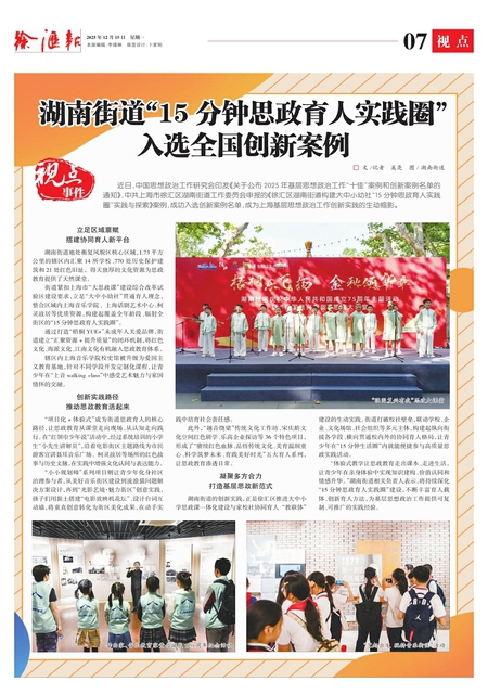 近日,中国思想政治工作研究会印发《关于公布2025年基层思想政治工作“十佳”案例和创新案例名单的通知》,中共上海市徐汇区湖南街道工作委员会申报的《徐汇区湖南街道构建大中小幼社“15分钟思政育人实践圈”实践与探索》案例,成功入选创新案例名单,成为上海基层思想政治工作创新实践的生动缩影。