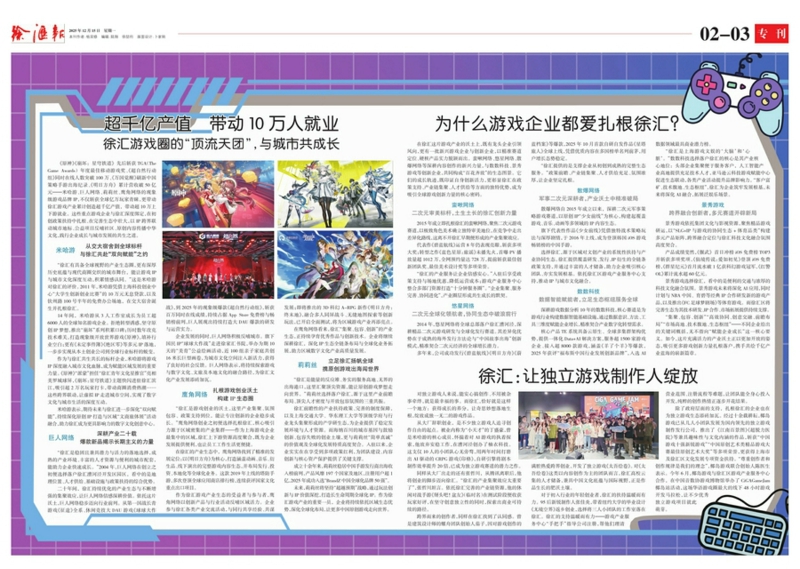 景秀游戏选择徐汇,看中的是便利的交通与浓厚的科技文化融合氛围。景秀游戏未来将深化AI应用,同时计划与NBA中国、育碧等经典IP合作研发新的游戏产品,以及推出《FC足球梦剧场》等体育游戏。而徐汇区将完善生态为其技术研发、IP合作、市场拓展提供持续支撑。“集聚、包容、创新”“高效协同、创意交融、前瞻布局”“市场高地、技术腹地、生态枢纽”———不同企业给出的关键词概括,无不指向“赋能企业成长”这一核心要义。如今,这片充满活力的产业沃土正以更加开放的姿态,吸引更多游戏创新力量扎根落户,携手共绘千亿产业蓝海的崭新篇章。