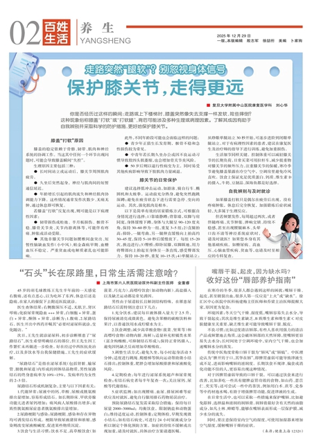 生活细节同样关键。 控制体重可以减轻膝关节的长期负荷。日常买菜可用拉杆车,减少提重物对膝关节的额外压力。注重膝关节的保暖,寒冷季节避免膝盖暴露在冷空气中, 空调房里避免冷风直吹。 饮食上保证充足优质蛋白、钙质、维生素D的摄入,牛奶、豆制品、深海鱼都是好选择。