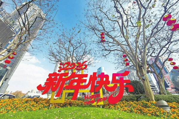 2026新年来临之际,徐汇区街头巷尾呈现出一派喜气洋洋的节日氛围。在徐家汇商圈中央绿地,翠绿草坪上摆放着醒目的红色“2026新年快乐”立体字牌,旁侧树木挂有红灯笼,金黄色花卉环绕四周。现代化高楼的硬朗线条,配合柔美的植物、热烈的新年装饰,绘就徐家汇商圈独有的新年画卷。朱亮 摄影报道