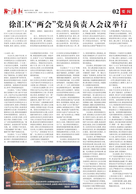 全会强调, 要扎实抓好2026年经济社会发展重点工作,谱写“创新徐汇、品质城区”新篇章。要以扩大内需为战略基点,提高经济运行调度的精准性科学性, 加快消费扩容升级,增强投资增长后劲,强化招商营商合力,巩固拓展经济回升向好态势。 要以人工智能为主攻方向,推进落实人工智能高地建设实施方案, 加快集聚功能性机构,完善关键要素供给,打造创业社区, 精准落地“人工智能+”项目,推动科技创新与产业创新深度融合。要以城市更新为重要抓手,围绕“一带一轴五大功能区”空间布局,加速推进土地收储出让和重大项目建设,系统推进空间格局优化。要以增进民生福祉为根本目的,加大保障和改善民生力度,提升居住品质,夯实基础民生,做优公共服务,让全龄人群乐享品质生活。要以精细化精准化为导向,全面提升城区治理水平,强化精细治理,加强基层治理,筑牢安全底线,努力建设美丽、韧性、智慧城区。