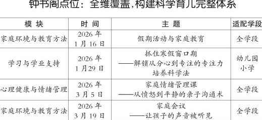 近日,2026徐汇家长夜校一季度公益课程安排已出炉。 据了解,本次公益课程的上课时间,安排在每周四18:30,地址位于新华博库、钟书阁两大优质点位。课程属公益普惠性质,聚焦当代家庭教育核心痛点,以科学理论为支撑,实操方法为核心,围绕“关键年级、关键节点、关键话题”,构建起覆盖孩子成长关键维度的系统化教育指导体系,助力家长破解育儿难题,搭建高质量亲子桥梁。