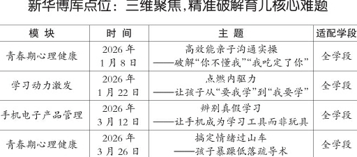 新华博库点位课程聚焦青春期心理健康、学习动力激发、手机管理三大核心方向: 青春期心理健康模块助力家长读懂孩子内心,构建和谐亲子关系;学习动力激发模块破解“催学难”困境,激活孩子内在学习潜能;手机管理模块提供科学管控方案,让科技成为成长助力。 通过专题课实现认知到实操的落地,精准突破家长育儿核心瓶颈。