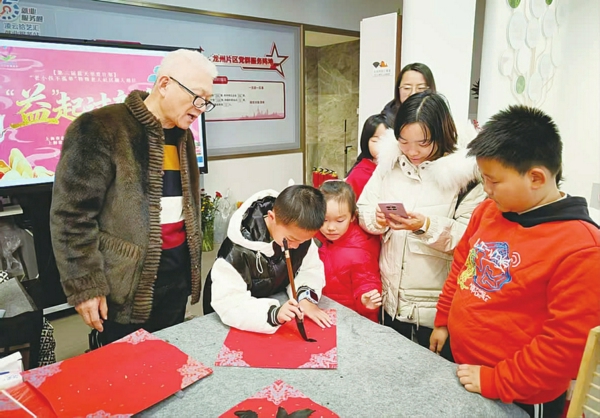 1月1日上午, 凌云街道拾艺汇文化活动中心内, 一场热闹欢腾的“元旦公益市集”温暖启幕,居民们踊跃赶“集”,共同庆祝 2026 元旦佳节。 活动室洋溢着新年的节日氛围和浓浓的暖意, 徐汇区书画协会理事、梅园书画社社长俞勇良来到现场,为居民书写“福”字,还有“马到功成”等马年吉祥话语赠送给居民。现场的小朋友也跃跃欲试。