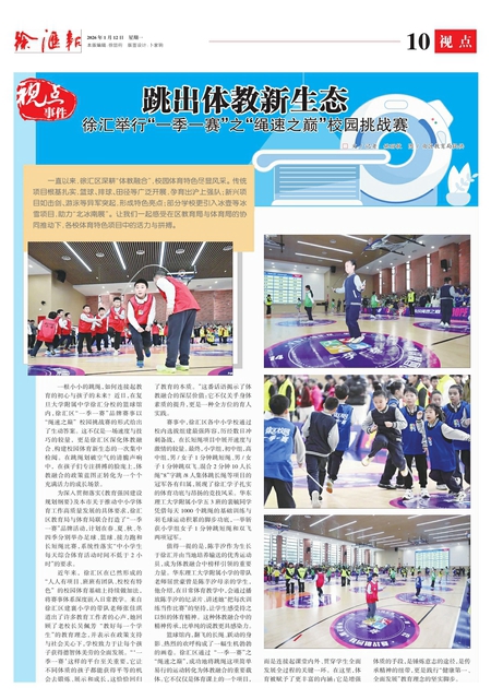 一根小小的跳绳,如何连接起教育的初心与孩子的未来? 近日,在复旦大学附属中学徐汇分校的篮球馆内,徐汇区“一季一赛”品牌赛事以“绳速之巅” 校园挑战赛的形式给出了生动答案。 这不仅是一场速度与技巧的较量, 更是徐汇区深化体教融合、构建校园体育新生态的一次集中检阅。 在跳绳划破空气的清脆声响中, 在孩子们专注拼搏的脸庞上,体教融合的政策蓝图正转化为一个个充满活力的成长场景。