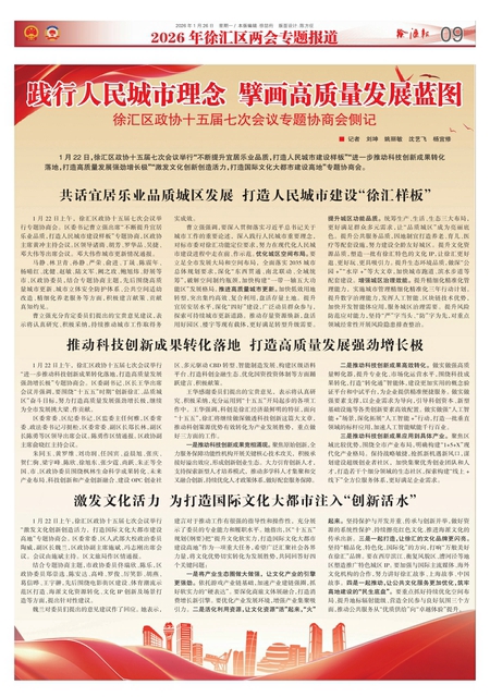 1月22日,徐汇区政协十五届七次会议举行“不断提升宜居乐业品质,打造人民城市建设样板”“进一步推动科技创新成果转化落地,打造高质量发展强劲增长极”“激发文化创新创造活力,打造国际文化大都市建设高地”专题协商会。