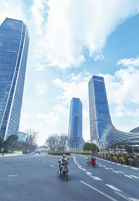 上海徐汇西岸“一港一谷一城”分别聚焦文化传媒、人工智能产业、金融产业,共同构成上海城市更新的重要示范区。 一港:西岸传媒港,一谷:西岸智慧谷(智塔为核心),一城:西岸金融城,三者形成了文化+科技+金融产业生态。 图为左侧星扬西岸中心与右侧西岸智塔在蓝天白云下交相辉映 殷志军 摄影报道