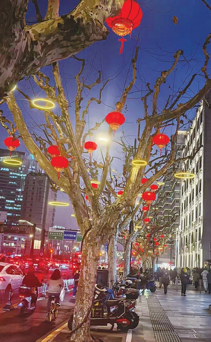 岁月匆匆,离马年新春还不到一周时间,徐汇大街小巷呈现出浓浓节日氛围。 图为漕溪北路蒲汇塘路段,夜幕降临,树上大红灯笼、发光圆环加之大楼外墙灯光、马路汽车尾灯共同打造了“温馨家园” 殷志军 摄影报道
