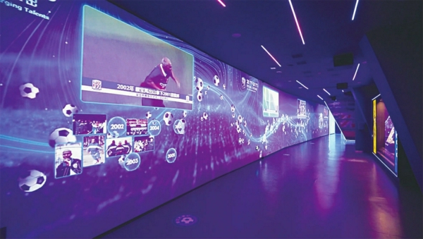 走进申花中心,最先唤醒球迷记忆的是申花文化体验中心,这也是项目的灵魂所在。 长达50米的“申花之路” 互动长廊上, 百余件珍贵展品错落陈列,这些展品大部分都是球迷捐赠。 从1999年申花与曼联友谊赛的纪念足球, 到2003年甲A时期阿尔贝茨的签名球衣,每一件都承载着俱乐部三十余年的风雨历程;360度环幕沉浸的“巅峰时刻”影厅,循环播放着所有夺冠比赛的历史影像,1995年、1998年、2001年等夺冠年份的金色泡泡在互动屏上闪烁,轻触便能重温赛场荣光;“群星闪耀”与“功勋教练”展区则借助红外感应与体感技术,让访客能与范志毅、谢晖等名宿“隔空互动”,甚至和吴曦、朱辰杰等现役球员生成屏幕合影,让足球历史从静态展陈变成可触摸、可交互的生动叙事。 特别设立的“第十二人”球迷文化展区,还集中展示了俱乐部与球迷的情感联结, 从4000余页归档史料到5万余张修复老照片,处处可见双向奔赴的温暖。