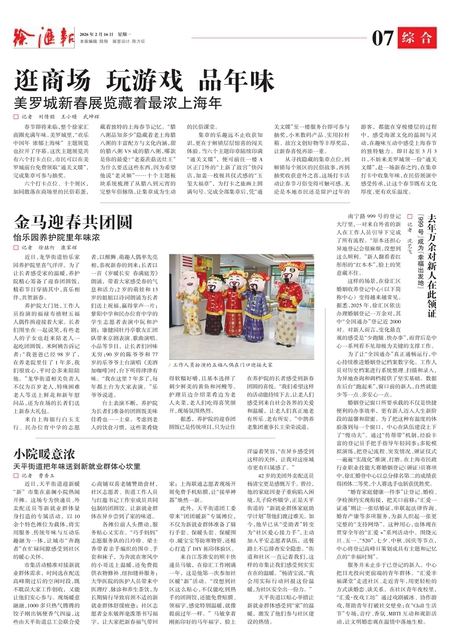 养护院大门处,工作人员扮演的福禄寿禧财五福人偶作揖迎接着大家。 长者们围坐在一起说笑,有些老人的子女也赶来陪老人一起吃团圆饭。 米阿姨告诉记者:“我爸爸已经98岁了,在养老院里住了1年多,我们很放心,平时会多来陪陪他。 ”龙华街道相关负责人不仅为百岁老人、特殊困难老人等送上鲜花和新年慰问品,还为在场的长者们送上新春大礼包。