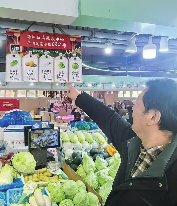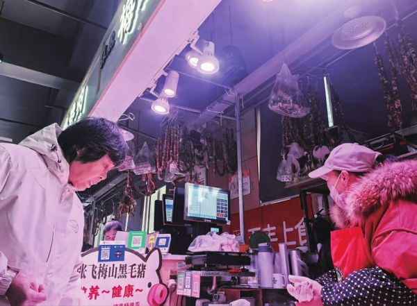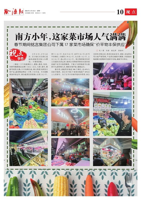 二楼近二十个肉禽摊位上,腊肠、酱肉、风鸡、风鹅等腌腊制品还剩三分之二左右,大排、猪爪、蹄膀等销售火爆;牛羊肉摊位前,摊主热情为顾客介绍产品;蔬菜摊品种近三十种,十分丰富。 不少商贩准备回家过年,部分蔬菜打折促销:生菜2元/斤、萝卜1元/斤、毛豆5元/斤、水芹5元/斤;32号平价摊位,小塘菜1.70元/斤、大白菜1元/斤、土豆2元/斤、卷心菜1.5元/斤。 铭言集团相关负责人吴建民告诉记者,集团公司积极贯彻市区商务委农副产品节日保供精神, 下属17家菜场春节长假留守九成管理人员,确保市场平稳、健康运行。