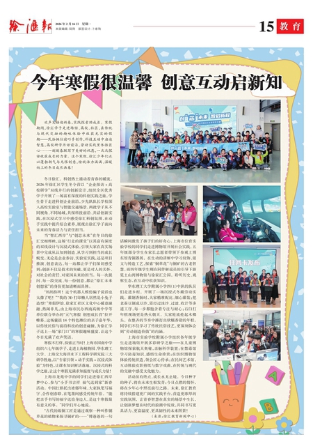 欢声笑语迎新春,实践探索助成长。 寒假期间,徐汇学子走进场馆、高校、社区,在传统与现代交融的趣味体验中收获充实的假期———民俗摊位前巧手创作,科技互动中启迪智慧,高校研学历访前沿,劳动实践里体悟匠心……一副副春联写下美好的祝愿,一次次探访收获成长的力量。 这个寒假,徐汇少年们正以蓬勃朝气与无限创意,绘就活力满满、温暖向上的冬日成长画卷!
