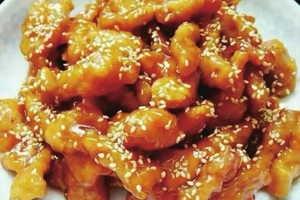 万能酱汁:4勺番茄酱、2勺糖、2勺醋、1勺生抽、1勺淀粉、3勺水,搅拌均匀后倒入锅中,煮浓稠后倒入炸好的里脊肉条翻炒均匀,最后撒上点白芝麻点缀就可以出锅了。