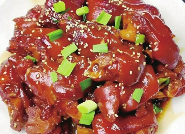 热锅放油后加入冰糖,小火慢炒至冰糖融化,倒入猪蹄翻炒至均匀上色。