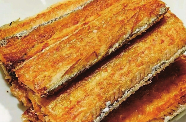 带鱼均匀裹上玉米淀粉或者面粉,平底锅表面刷油,小火油热下带鱼,慢煎至两面金黄即可。