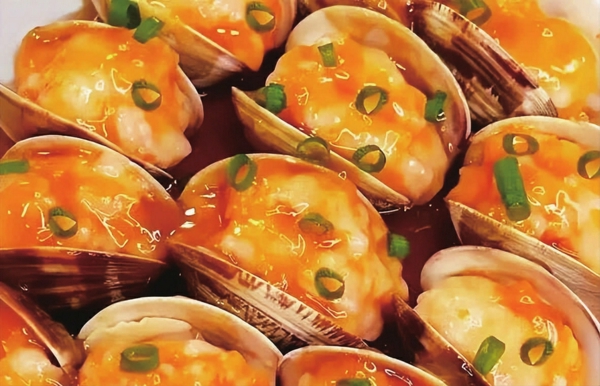 将虾滑添加至蛤蜊中, 冷水上锅蒸12分钟,然后撒上葱花,淋上热油和蒸鱼豉油。