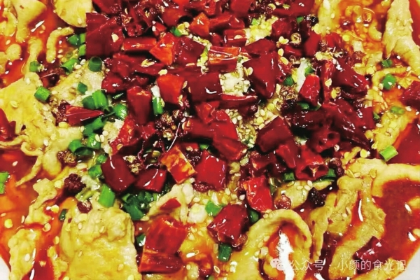 逐片下入肉片煮至变色盛出。 面上加蒜末、青红椒、干辣椒、芝麻、花椒、淋上一勺热油激发香味即可。