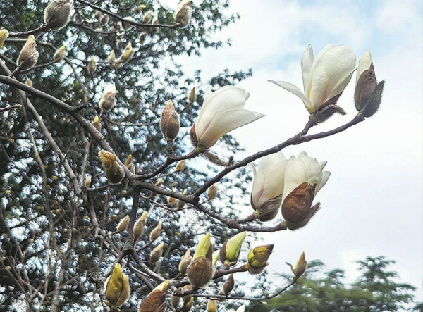 白玉兰,又名“望春花”,1986年被确定为上海“市花”。 它还被喻为“花中君子”,先花后叶,在早春绽放。 白玉兰花寓意高洁与真挚的情感、感恩以及奋发向上的力量。 图为位于上海植物园植物大楼处的数株白玉兰已在春风吹拂、雨水滋润下吐蕊绽放(相关报道详见第4版) 殷志军 摄影报道