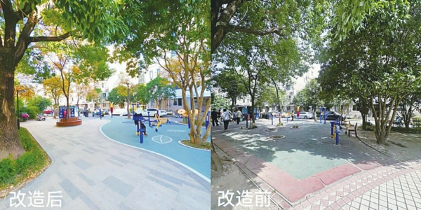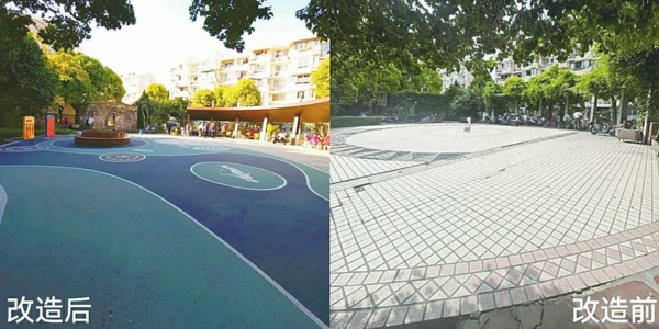 在基础安全和功能完善方面, 改造团队对地面进行了分区铺装。 健身区和儿童活动区换上了塑胶地垫, 缓冲防滑又透水,健身、玩乐更安心;通行区和广场则选用坚固耐磨的花岗岩,确保出行顺畅,也经得起长久使用; 原来的休闲广场廊架也变了样———加装了遮阳遮雨的顶棚,成了实用、风雨无阻的“社区共享客厅”,居民们在这里聊天、下棋,空间“活”了,邻里也更亲近了。