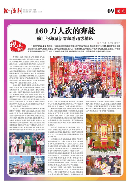 漫步徐汇,全域旅游的新图景徐徐展开,各个板块都有专属精彩。衡复风貌区以艺术点亮街区,话剧《鹿鼎记》座无虚席,《骐骥迎春———春天的音乐碎片》音乐会奏响新春乐章,狮语画廊、胶囊上海等艺术空间的当代艺术展,让老洋房焕发新潮消费活力,勾勒出“精致慢游”的徐汇模样。徐家汇源推出的“城市博物行”Cityhike徒步线路, 将这片上海首个开放型都市旅游景区化作“大型户外博物馆”,在脚步中邂逅中西文化交融之美,探寻海派文化根脉,徐家汇源景区累计接待游客21.9万人次。徐汇艺术馆、西岸美术馆、 龙美术馆等各大美术场馆坚守“春节不打烊”,13场高品质艺术展览如约而至,2.3万人次前来观展,同比增长108%,让艺术成为新春的别样底色。
