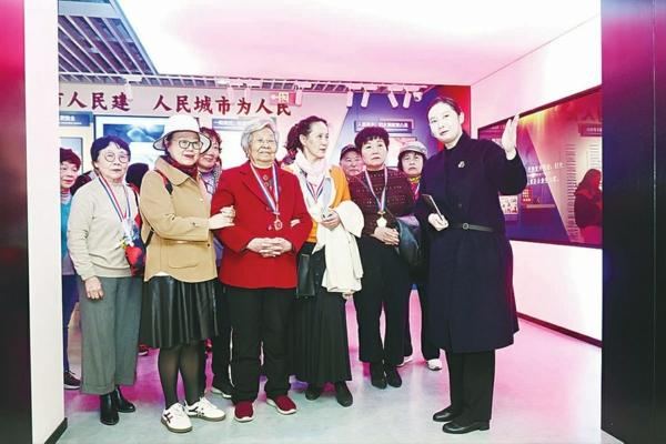 跟随讲解员的步伐, 百老讲师团的成员们参观了“觉醒·解放”“新生·自强”“奋进·建功”“时代·使命”四大篇章,在文物实物、文献、影像资料、AI视频前,大家仔细观看展品细节、交流参观心得。 成员们有的戴着当年“劳动模范”的奖章,有的戴着“上海百老讲师团”的奖牌,或驻足细观,或有感而发:“这里有64位牺牲的女烈士的名字,做出一个‘解放’的字样,很有新意。 ”“这个纺织工人的形象就是我们以前上班时的样子,机器不能停,我们都是三班倒, 干得热火朝天的。 ”“那时刚学习计算机, 这种大部头的机器感觉很新鲜。 现在的一个手机都能搞定了。 ”……在“国之芬芳源:榜样力量更永恒”展品前,黄宝妹捐赠的电影相册、 中国共产党上海市第一届代表大会第二次会议代表证、 中共八大代表证清晰可见,当年的“劳动模范”们和黄宝妹一起在此留影纪念。