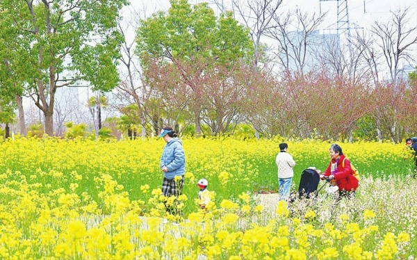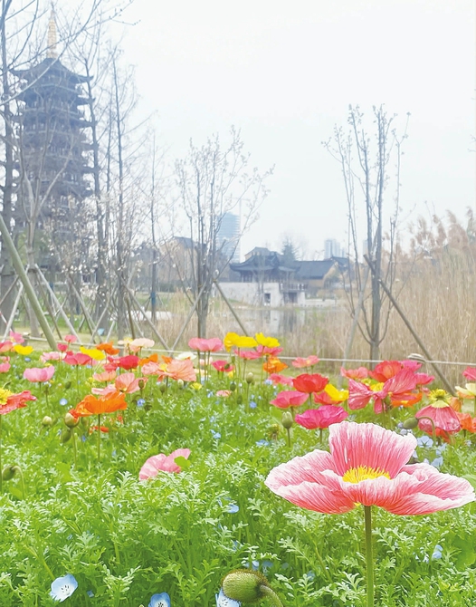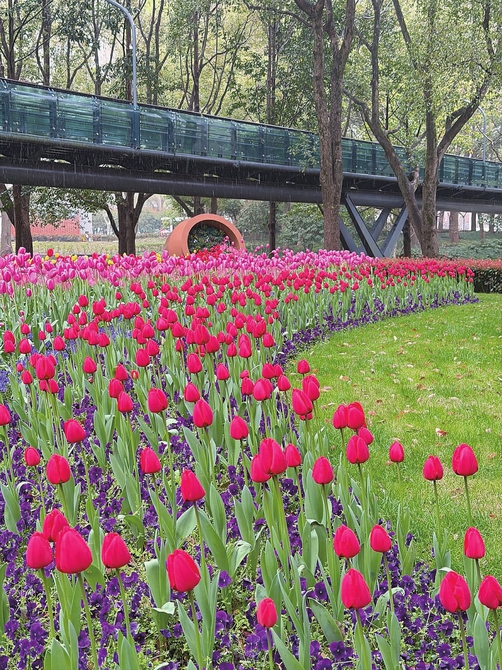 中环绿廊起伏的草坡上, 金色油菜花与郁金香交织成彩色织锦,粉紫、橘黄、雪白的花瓣随风轻颤,与枝头盛放的早樱共同勾勒出春日的饱满层次。 西岸艺术公园内,公园籽播区成片的虞美人随风摇曳,与点缀在其中的蓝色喜林草交织在一起,仿佛莫奈花园, 每一步仿佛踏进浪漫画卷。武康大楼附近,春日的浪漫更显海派韵味,沿街窗台的郁金香错落排布,红、橙、紫等色彩与大楼标志性的船形立面相映成画,午后阳光为花瓣镀上金边,往来行人驻足留影,让历史建筑与春日花海共生诗意。
