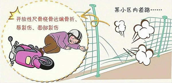 谭某系某小区业主罗某的母亲,住在罗某家。 该小区由某置业公司开发建设,某物业公司负责日常物业管理。 2024年5月11日7时许, 谭某骑电动车从家中出发,在通过小区右转弯道路时,未减速慢行,径直冲破道路左侧的绿色铁丝防护网,摔落至防护网另一侧受伤。该防护网由某置业公司设置,一侧为已交付的住宅区域;另一侧为在建商铺区域。 事故发生时,事发路段路面平坦宽阔、 视野良好,无任何凸起、遮蔽及障碍物。