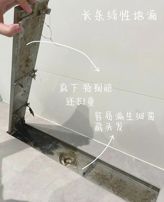 虽然地漏尺寸比较大, 但是下水口都是一个大小, 根本不会因为尺寸问题,影响下水速度。反而地漏尺寸过大,还会藏污纳垢,像是头发啊、污垢啊, 会留在存水口里面, 不仅滋生细菌, 还会有难闻的味道。 这也是为什么,装了这个地漏之后,卫生间总是臭气熏天的原因之一。 只要是装了这种地漏, 基本隔三差五就要把地漏掀起来,清理一下污垢。 大家装修的时候,最好别装这种没啥用的长条地漏,老老实实做普通地漏,省钱还实用。