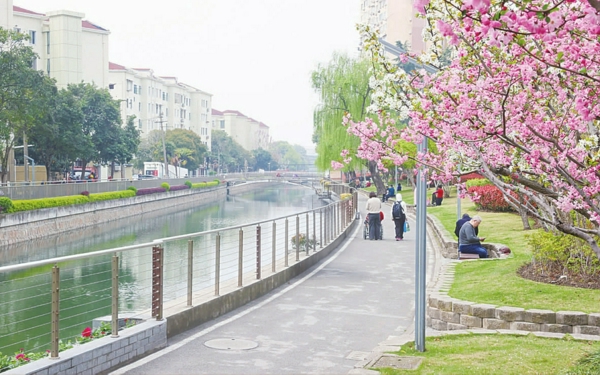 不远处的北潮港畔,几张休闲座椅上坐满了唠家常的老人。“附近两个小区的老人都往这儿跑,这里干净舒服, 坐下来聊聊天、看看河景, 心情别提多好了。”居民童友元和老伴,几乎每天都会约上老友来这儿坐一坐。风掠过水面,带着岸边的花香飘来, 老人们的笑声顺着河道漫开。
