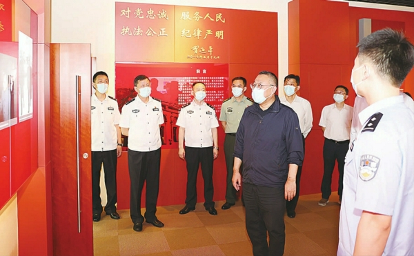 随后,曹立强一行来到上海市公安局特勤局,参观局史荣誉室并与特勤局领导座谈(如图 刘坤 摄)。 曹立强感谢特勤局长期以来对徐汇经济社会发展、城区和谐稳定、新冠疫情防控等方面的支持和帮助,并表示,徐汇将会一如既往关心和支持特勤工作, 积极发挥服务保障作用,与特勤局共担使命、携手奋进,共同服务好上海经济社会发展大局。
